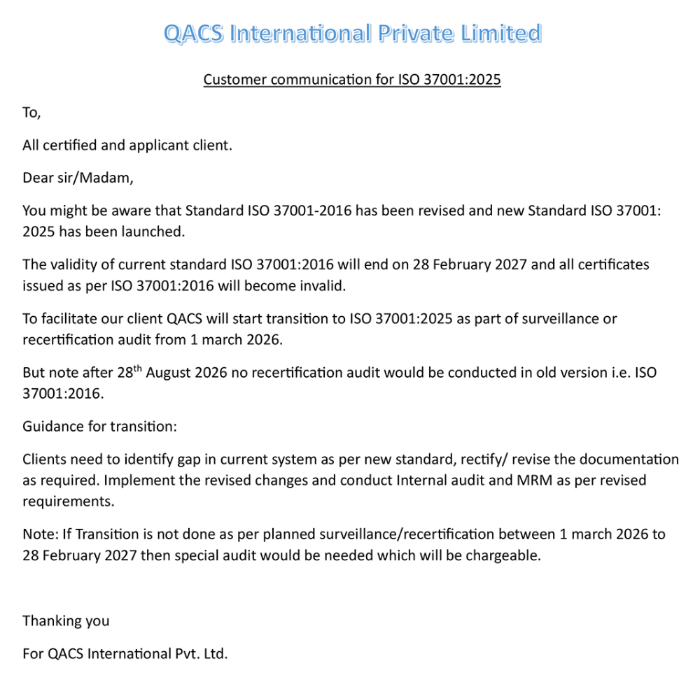 “Information regarding transition of ISO 37001:2016 to ISO 37001:2025 by IAS accreditation”“Public notification of Transition to ISO 27006-1:2024”